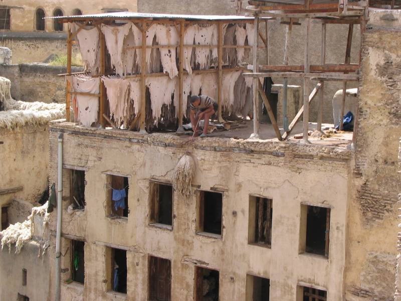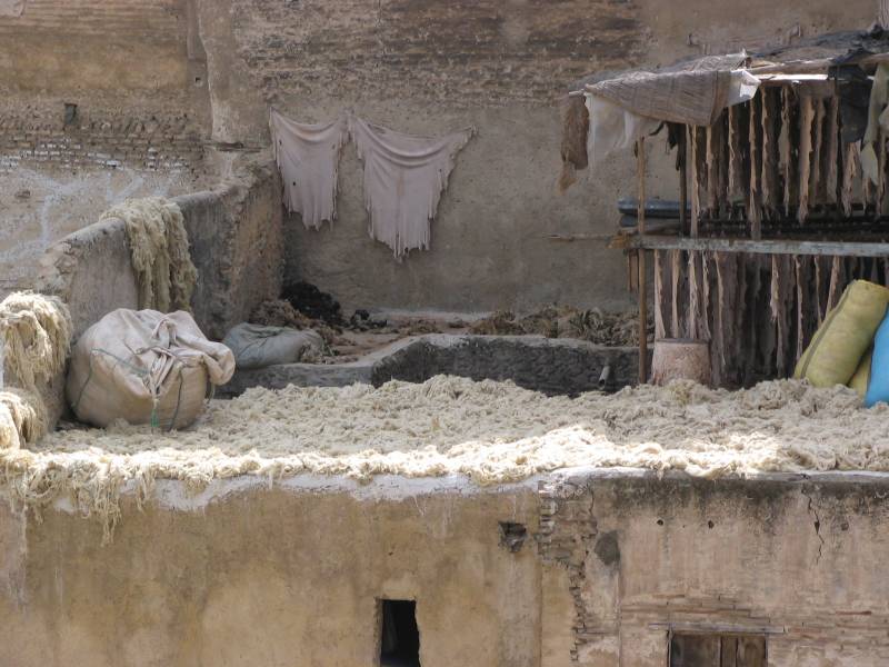 A sharp acidic stench rises from the kaleidoscope of colors below, a combination of the sheep's urine and pigeon dung used in the dyeing process. The tanners have had to get used to the smell, the tourists are offered sprigs of mint as nosegays - which really helped. Hides are dried by hoisting them by hand to the top of surrounding buildings to use all available sun.
