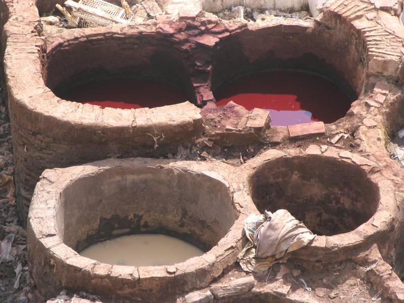 The tannery is a huge complex with 50 or 60 stone vats like a giant paint box. The vats are filled with pools of richly colored liquid ranging from snow white through grey, milky brown and pale pinks to garnet red, metallic blue and saffron yellow. It is complete and immaculately preserved mediaeval tannery. Water, heaved up from the Fès River by a massive wheel, is distributed amongst the vats, in which the tanners mix the heavy combination of water, hides and dye using only their feet and the pressure of the muscles in their legs.
