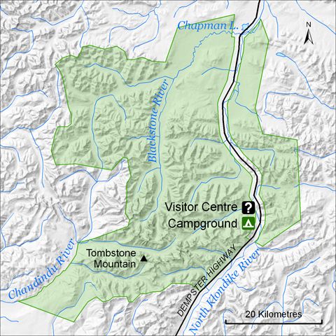 for about 70 kilometres from the southern boundary to Chapman Lake. The Tombstone campground and interpretive centre