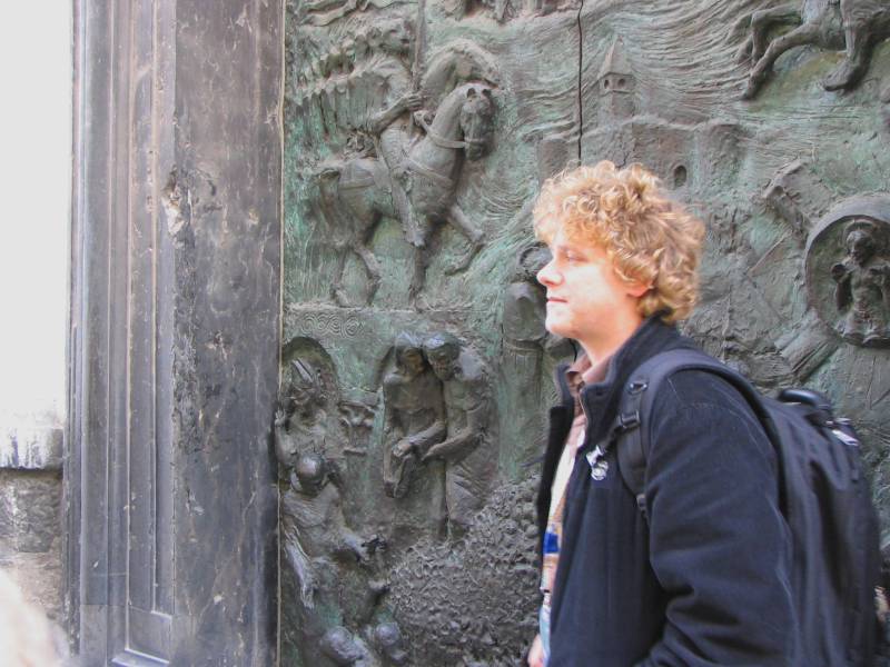 Marin, our local guide, in front of cathedral door