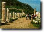 In front of the odeion was a commercial center, called the "Basilica". It was next to the State Agora to expedite business affairs. The building was erected with three naves at the time of Augustus in the 1st century AD. Judging by the holes bored into it, there was a single-nave gallery here in the Hellenistic Period. A number of the columns have been restored and set in place. In Byzantine times there was a large open court (stoa) to the side of the Basilica that was decorated with numerous statues. The court had three doors, the largest opening from the basilica. Giant statutes of Augustus and his wife, Livia that were here are now in the Ephesus Museum. The basilica was 165 m. in length and had typical bull-headed columns in the Ionion style.