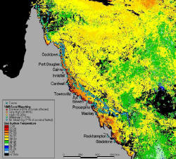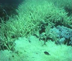 1. What is a coral? Early biologists used to think that corals were plants. In fact they are animals and are related to sea anemones, jellyfish and hydroids. All have been classified within the phyerata, since they have the same basic body design -- that is, they are symmetrical about a central axis (termed radially symmetrical). Basically each has a sac-like body which has a central cavity or stomach. There is a single opening to this cavity which serves as both a mouth and anus. This is often surrounded by a circle of tentacles (often more than one) which contain stinging cells (nematocysts). Members of the coelenterate phylum may occur in a bell-shaped form (termed a medusa) which floats or swims in the water (e.g. jellyfish) or they may occur as polyps which are attached to hard surfaces in the ocean (e.g. corals). Some occur only as polyps (e.g. corals) whilst others occur only as medusae (e.g. jellyfish). Others may occur in both forms during their life cycle (e.g. hydroids). Corals may consist of only one polyp (solitary) or they may comprise many hundreds of polyps (colonial), all joined together in the one structure (termed a colony). There are several different types of corals. Those that possess 8 tentacles (or multiples thereof) and produce an almost jelly-like body are called soft corals. Those that usually have a plant-like growth and a horny skeleton which runs along the inside of the stem (making it very strong) are called gorgonians. They are more commonly referred to as sea-whips and sea-fans. Finally there are the true stony corals which are the main building blocks of reefs. Their hard calcareous skeletons are produced by the polyps themselves. Each polyp in a colony is suspended inside a tiny cup of skeleton and is connected by a thin layer of tissue which overlies the surface of the colony. Small single-celled algae called zooxanthellae are of great benefit to corals. They live inside the tissues of most corals and produce nutrients (organic carbon) which are sources of food for the corals. As these nutrients are produced via photosynthesis the corals are able to build their skeletons much faster in the light than in the dark. Corals also possess chemical compounds which prevent them from being affected by ultraviolet radiation when exposed at low tide or d u ring prolonged periods in very shallow water. These compounds are being investigated at the Australian Institute of Marine Science because they may prove very effective as ultraviolet blocking agents in various substances (such as sunburn creams, paints and plastics). Corals reproduce in several different ways. Some bud or split from the original polyp (a form of asexual reproduction). Sexual reproduction also occurs. In some corals the eggs are fertilized internally. These are then brooded within the body of the parent and at the appropriate time are released as planulae. Other species shed their eggs and sperm into the water column and consequently fertilization occurs externally (i.e. outside the parent). This strategy is very "hit and miss" given the large volume of the oceans. To ensure that sufficient fertilization takes place many corals on the Great Barrier Reef spawn together on one night of the year. This occurs about 5 days after the full moon in late Spring (October / November). It is a spectacular event! Whilst corals occur throughout the world they are most abundant in the tropics where water temperatures are highest. Corals feed primarily during the night by expanding their tentacles and capturing minute plankton from the water. They also occur in a variety of forms, the most common being branching (sometimes called staghorn corals) and plate-like (table corals) colonies. 2. What is a coral reef? Surprisingly, the mammoth reef systems which occur in many parts of the world result from the combined activities of the small, humble coral polyp. Reefs are made up of layers of coral skeletons cemented together by coralline (encrusting) algae to form an extremely hard limestone structure. The world's largest reef system, the Great Barrier Reef, has developed in this manner. It is not one reef but a complex of almost 2,900 individual reefs stretching for a distance of about 2,300 kilometers. These individual reefs have resulted from the growth of hard corals on eroded formations (e.g. valleys, hills and ridges) which millions of years ago were out of the water when sea-level was much lower. The Great Barrier Reef comprises many different types' of reef formations. Those that have developed around continental islands (e.g. those in the Whitsunday Islands) are termed fringing reefs. Those that form long thin formations along the outside edge of the northern part of the Great Barrier Reef (much like a string of sausages) are termed barrier reefs. These can be up to 30 kilometers long and are divided by narrow passages. There are also a variety of other formations including lagoonal, crescentic and planar reefs. The formation of these different reef types depends largely on the surface on which they are being formed, the recent geological history of the area (i.e. changes in sea level and land formations), and water temperature and exposure to wave action. It has little to do with the types of corals that were important in their formation. Some reefs (e.g. Heron Island off Gladstone and Green Island off Cairns) have sandy islands on them. The combined action of waves and water currents causes the deposition of finely eroded coral material which over many years may lead to the development of these islands. Most reefs have a solid front which receives much of the force of the ocean swell. This is called the windward side of the reef. It forms a wall which slopes (sometimes quite steeply) to the bottom of the seabed (generally 40-50 m in the Great Barrier Reef). The top of this structure, termed the reef flat, may become exposed at low tide. It is normally dotted by small, squat corals which are able to withst