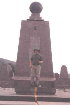John standing in both Southern and Northern Hemispheres Equator monument in back Yellow line is the equator